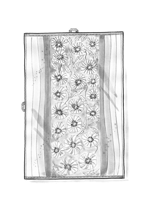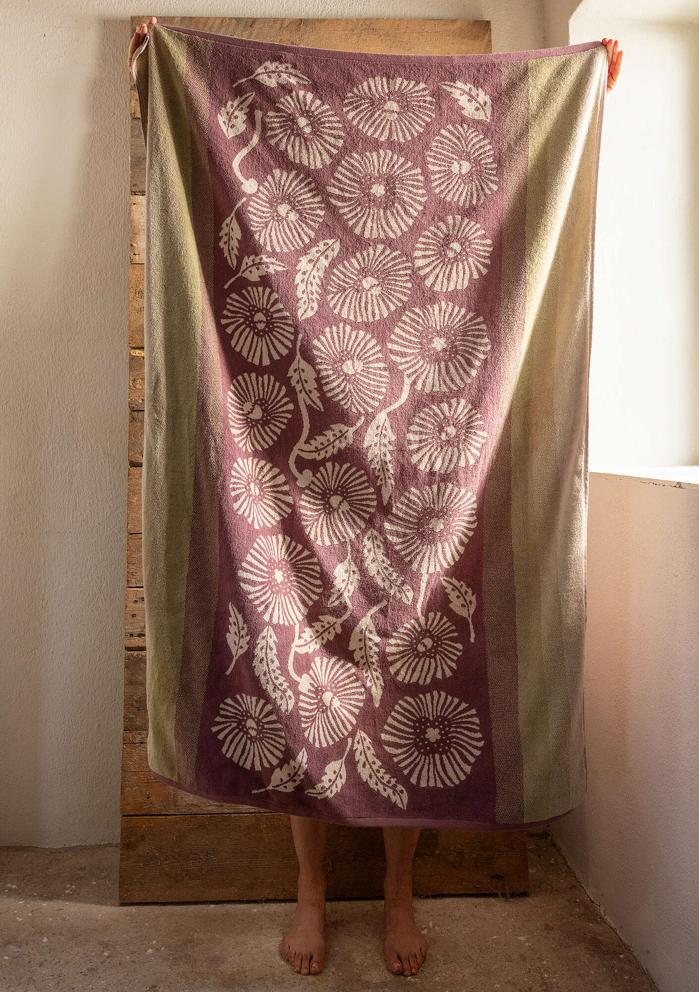 - A generously sized bath sheet, with flowers and striped sides in harmonious colors. Soft and comfy terry with excellent absorbency. Contrasting color at the edge and hangers on the short and long sides.Size and Measurement