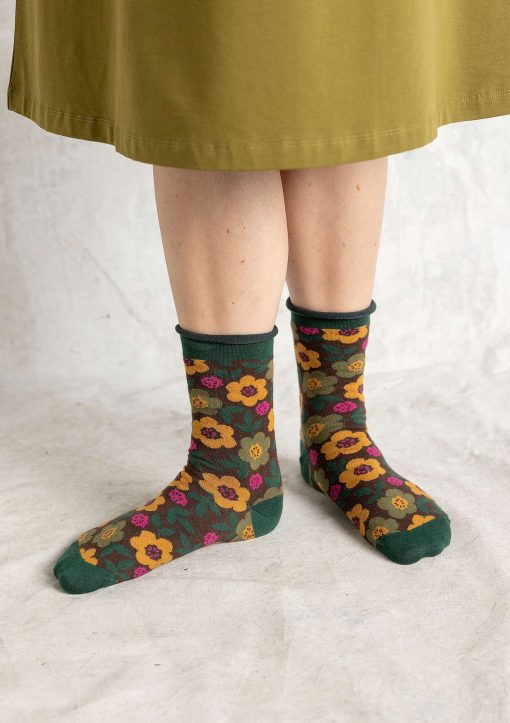 - Floral socks in several fabulous colors. Comfortable rolled edge in an accent color at the top.Size and Measurement