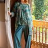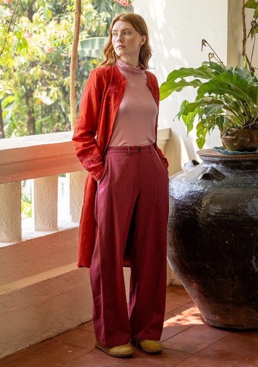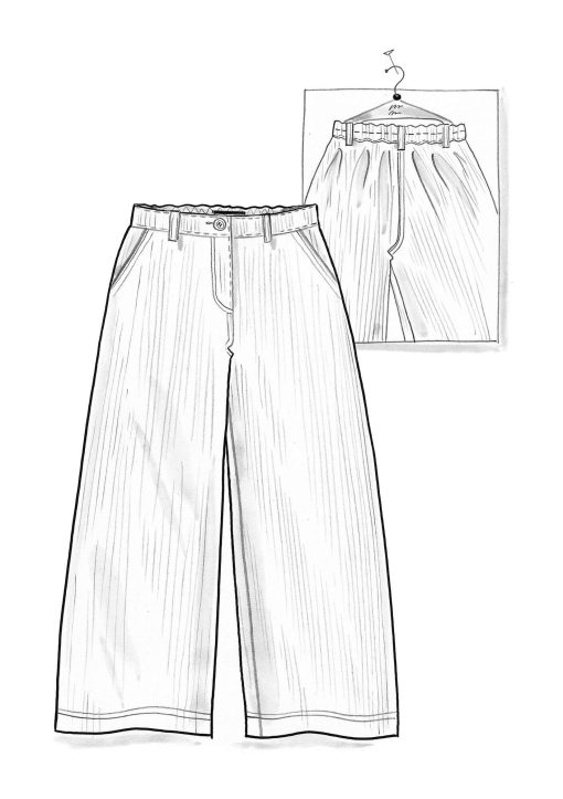 - Twill-weave pants with beautiful colors in the stripes. Full-length legs, fly, belt loops and inset front pockets. Waistband with elastic sewn at the center back for a flexible fit. Imitation horn buttons.Size and Measurement