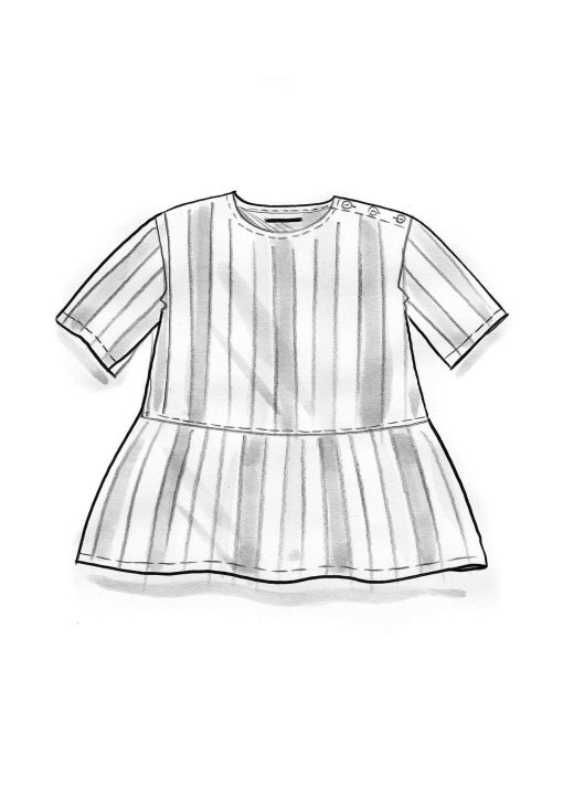 - Digitally printed blouse with a ruffle at the lower edge. Subtle boat neck. Half-length sleeves and mother-of-pearl button closure on one shoulder. Gathered seam at the waist, creating a touch of volume below.Size and Measurement