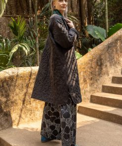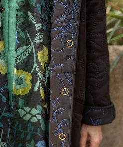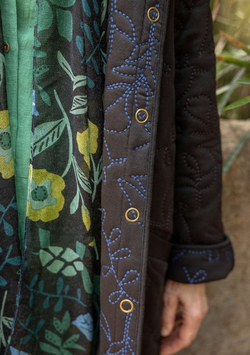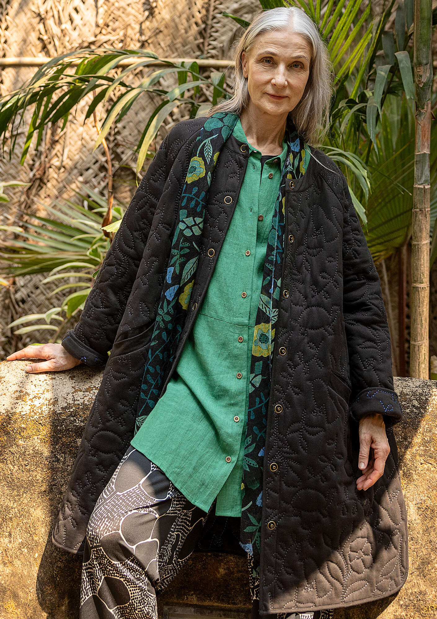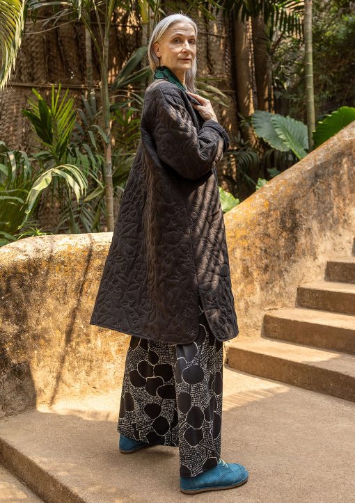 - 100% cotton. The cotton is certified organic. Filling in 100% polyester. The dyeing process is certified. Machine wash cold, delicate cycle. Stretch gently to length while damp. Do not tumble dry. Shrinkage 3-4%. Made in Delhi, India.