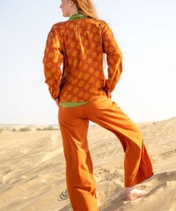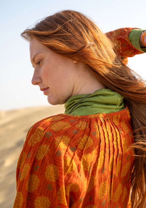 - 100% cotton. The cotton is certified organic. The entire production chain is certified. The fabric is digitally printed. Machine wash warm, delicate cycle. Medium iron. Shrinkage 2-3%. Made in Faridabad, India.