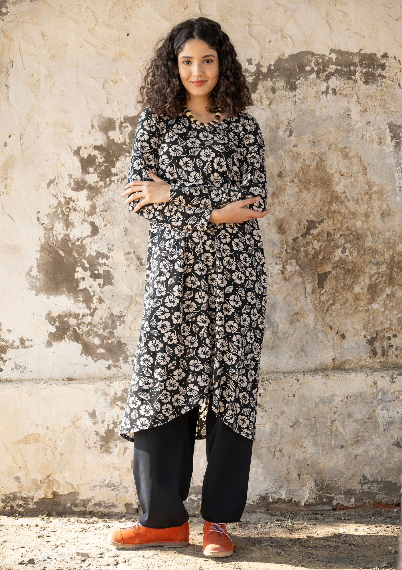 - Printed jersey dress in which the lower section is composed of angled, overlapping tiers. Round neckline and long sleeves.Size and Measurement