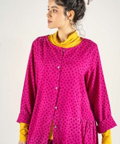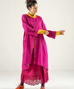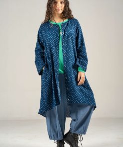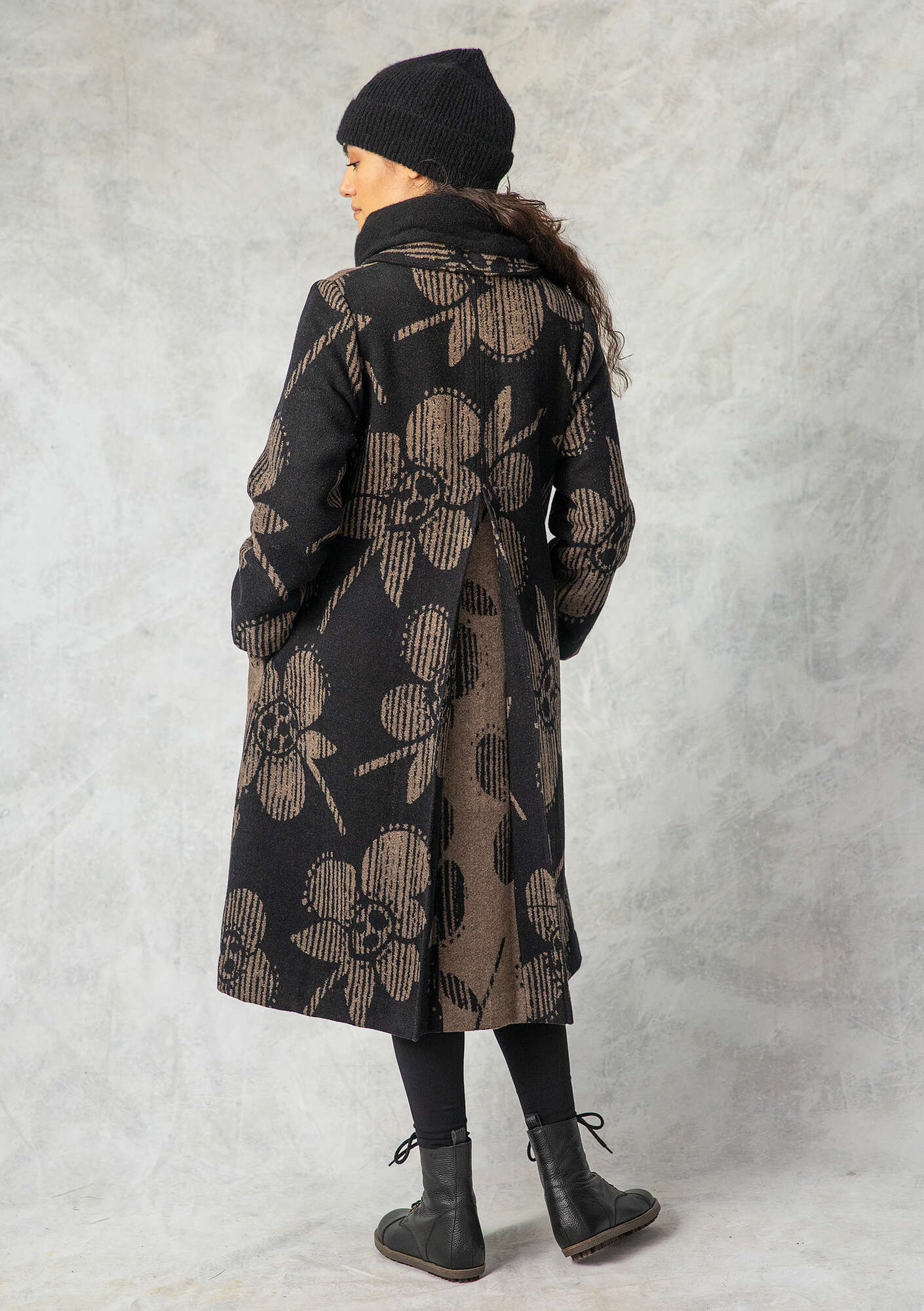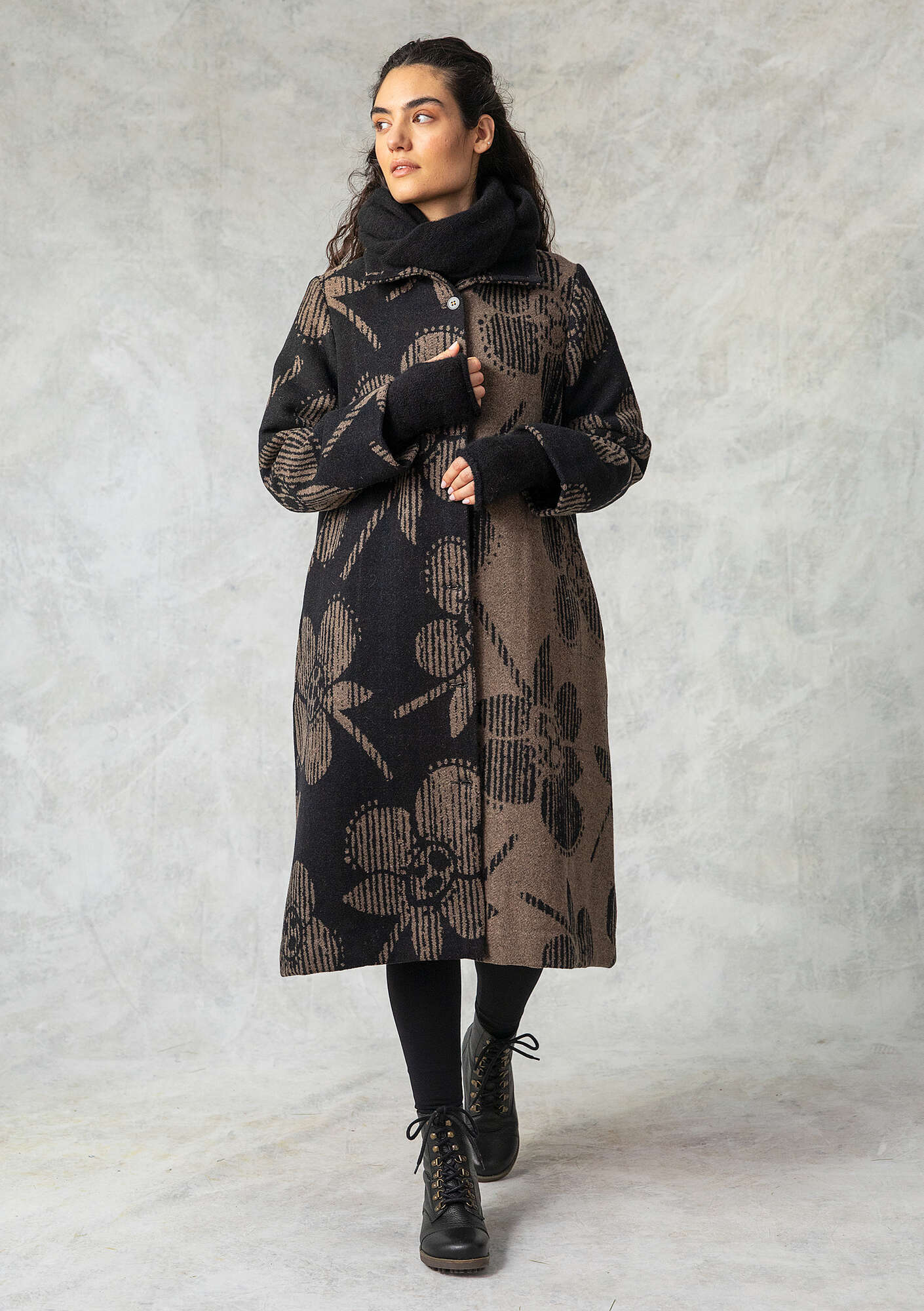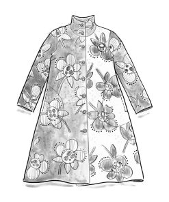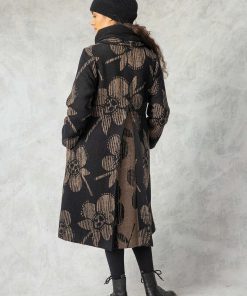 - Jacquard-woven long coat with a big, beautiful pattern design. Style with a funnel neck and a vent at the back, where the pattern colors are reversed for a beautiful effect. Fully lined with a solid-colored lining, metal buttons sewn on with thread in a contrasting color, and side pockets.Size and Measurement