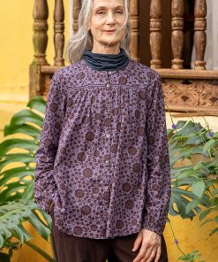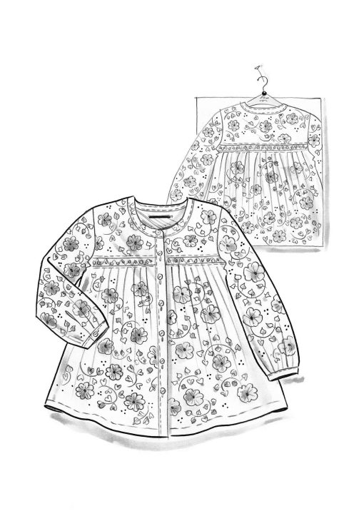 - Printed blouse in a fully buttoned style with a yoke at the front and back, and an inset crocheted band. Band collar and cuffs with trim and a button. Mother-of-pearl buttons.Size and Measurement