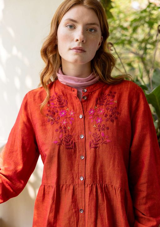 - Chambray-weave dress with embroidery on the front and on the sleeves. Fully buttoned style and a gathered seam at the waist. Round neck with a band collar and button at the cuffs. Long sleeves, side pockets and mother-of-pearl buttons.Size and Measurement