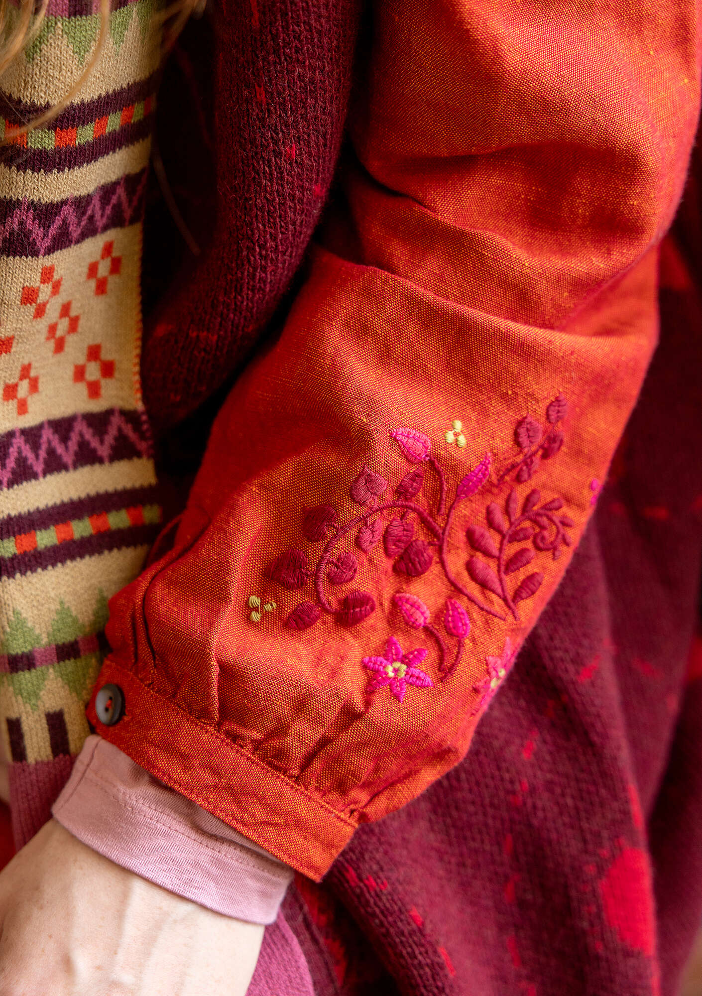 - 55% cotton/45% linen. The cotton is certified organic. The linen is dew-retted, a natural process in which the sun and dew handle the work without chemicals and with minimal water use. The entire production chain is certified. Machine wash warm, delicate cycle. Medium iron. Shrinkage 2-3%. Made in Mumbai, India.