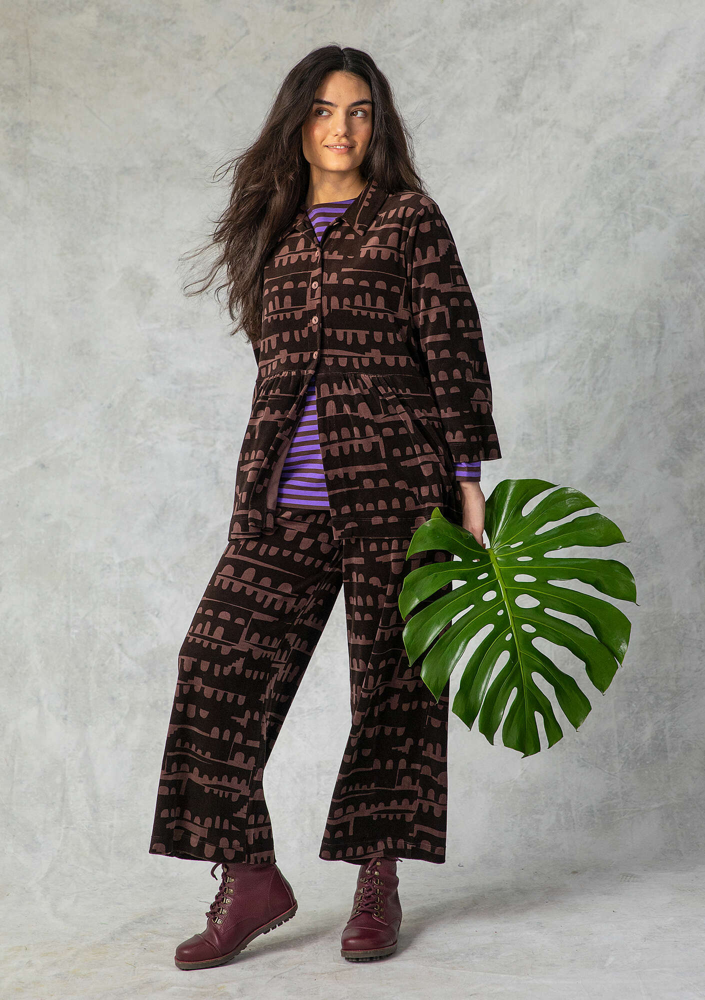 - 80% cotton/20% polyester. The cotton is certified organic. The polyester is recycled. The dyeing process and print are certified. Machine wash warm, delicate cycle. For best results, we recommend tumble-drying in order for the velour to retain its softness and sheen after washing. It is sufficient to run it in the dryer briefly on low heat and then to hang the garment on a hanger to dry completely. Shrinkage 2-3%. Made in Sandanski, Bulgaria.