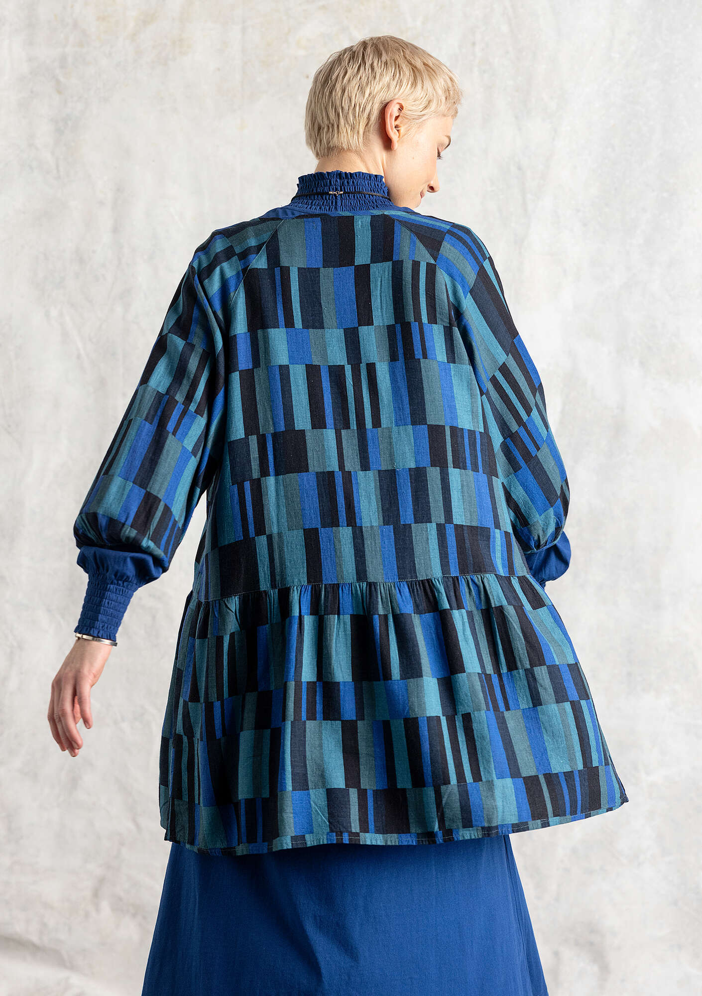 - Fully buttoned blouse with raglan puff sleeves. A lower tier gives this garment flattering width. Welt pockets with a button at the front. This fabric has an especially beautiful drape. Matte, dyed buttons.Size and Measurement