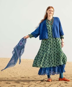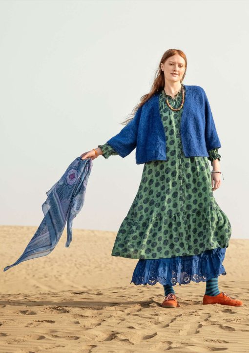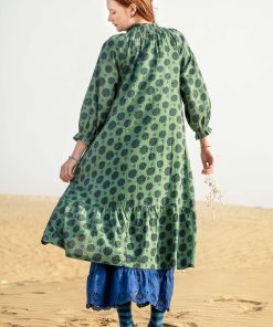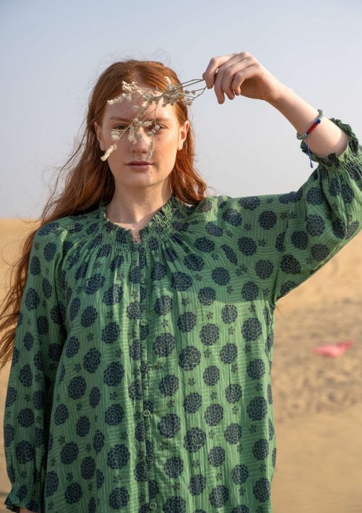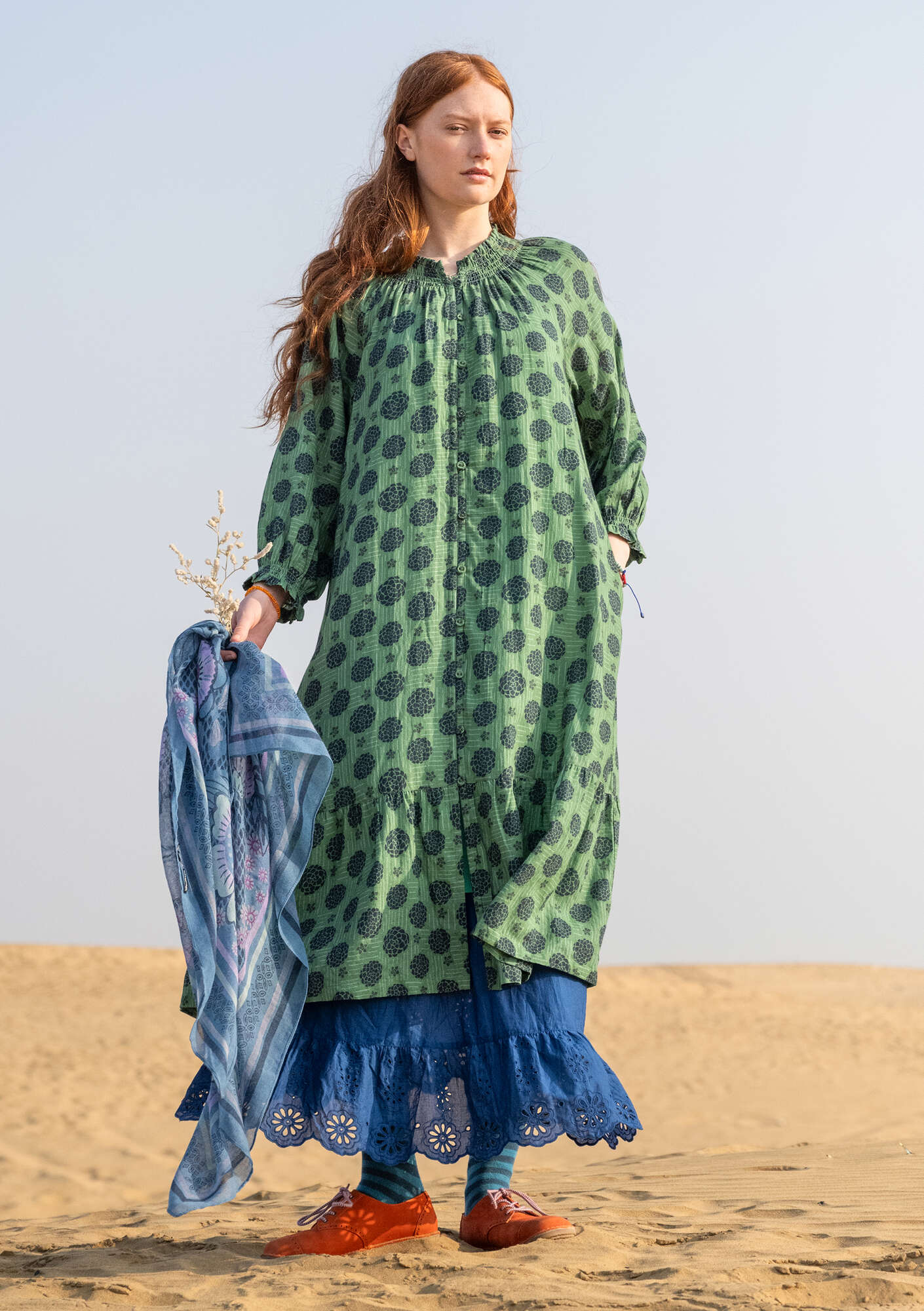 - 100% cotton. The cotton is certified organic. The entire production chain is certified. The fabric is digitally printed. Machine wash warm, delicate cycle. Medium iron. Shrinkage 2-3%. Made in Faridabad, India.