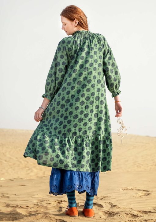 - Printed dress with a ruffle along the hem. Round neckline with smocking. Fully buttoned, covered buttons and side pockets. Raglan sleeves, slightly longer than three-quarter length, with smocked cuffs.Size and Measurement