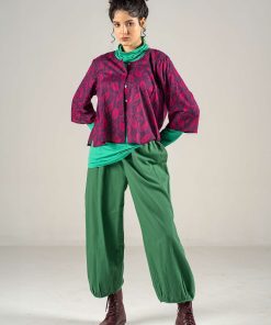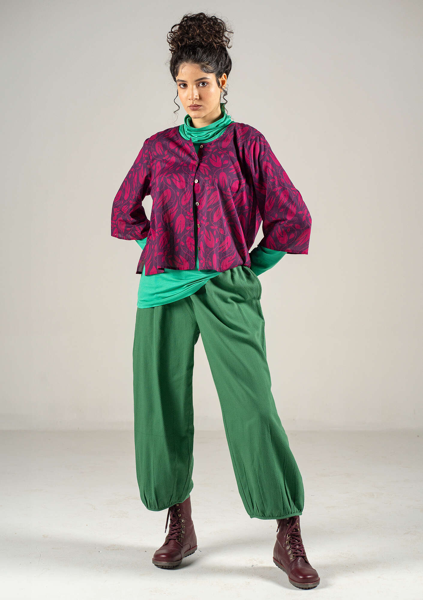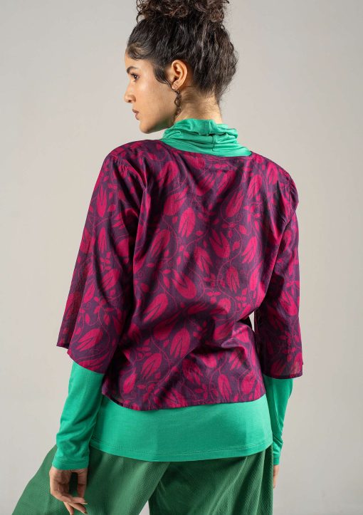 - Short, versatile blouse with printed tulips. Sleeves land just below the elbow. Decorated with lovely mother-of-pearl buttons. Slits at sides.Size and Measurement