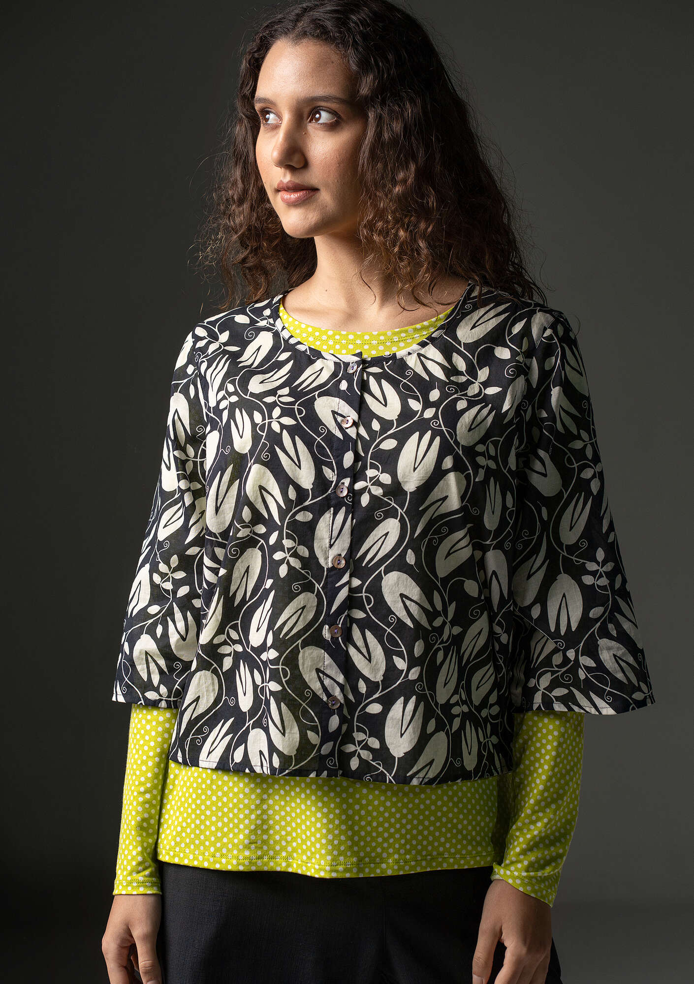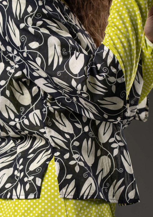 - Short, versatile blouse with printed tulips. Sleeves land just below the elbow. Decorated with lovely mother-of-pearl buttons. Slits at sides.Size and Measurement
