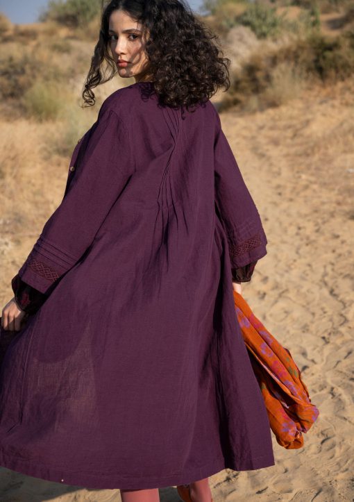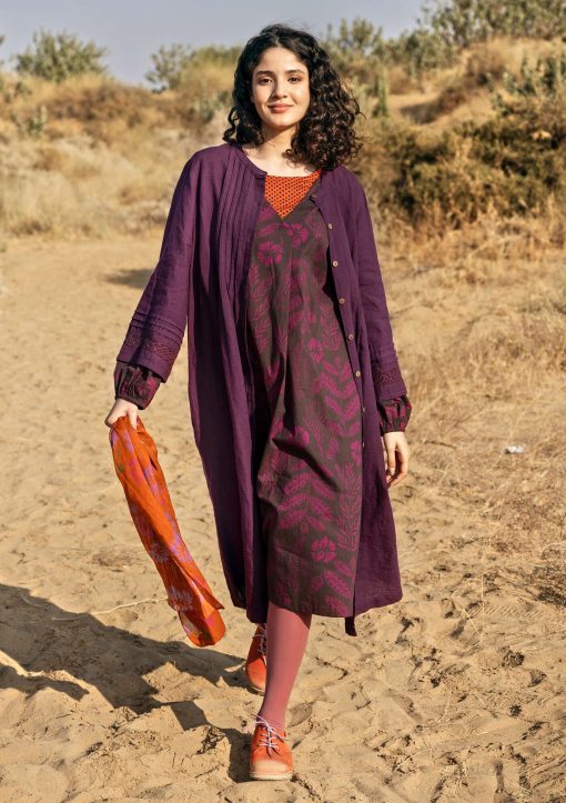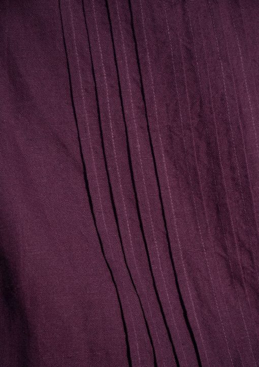 - 55% cotton, 45% linen. The cotton is certified organic. The linen is dew-retted, a natural process in which the sun and dew handle the work without chemicals and with minimal water use. The entire production chain is certified. Machine wash cold, delicate cycle. Medium iron. Shrinkage 2-3%. Made in Mumbai, India.
