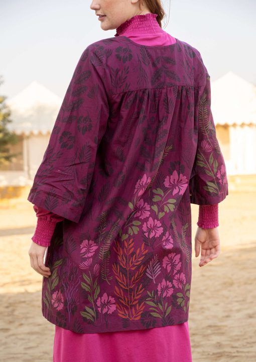 - Digitally printed tunic with a placed pattern that varies on different parts of the garment. Round neckline and three-quarter length trumpet sleeves. Buttons in natural-colored coconut wood.Size and Measurement