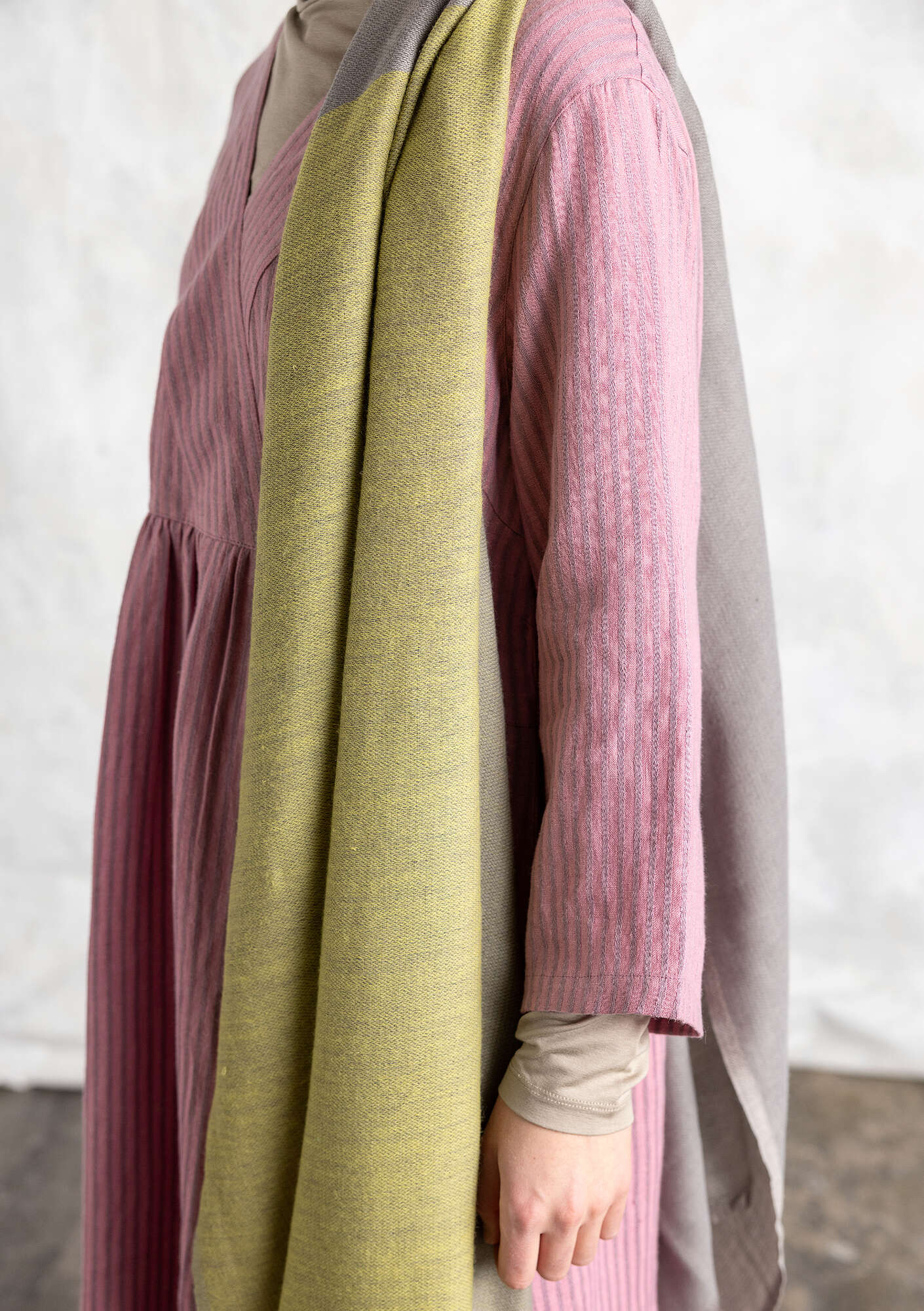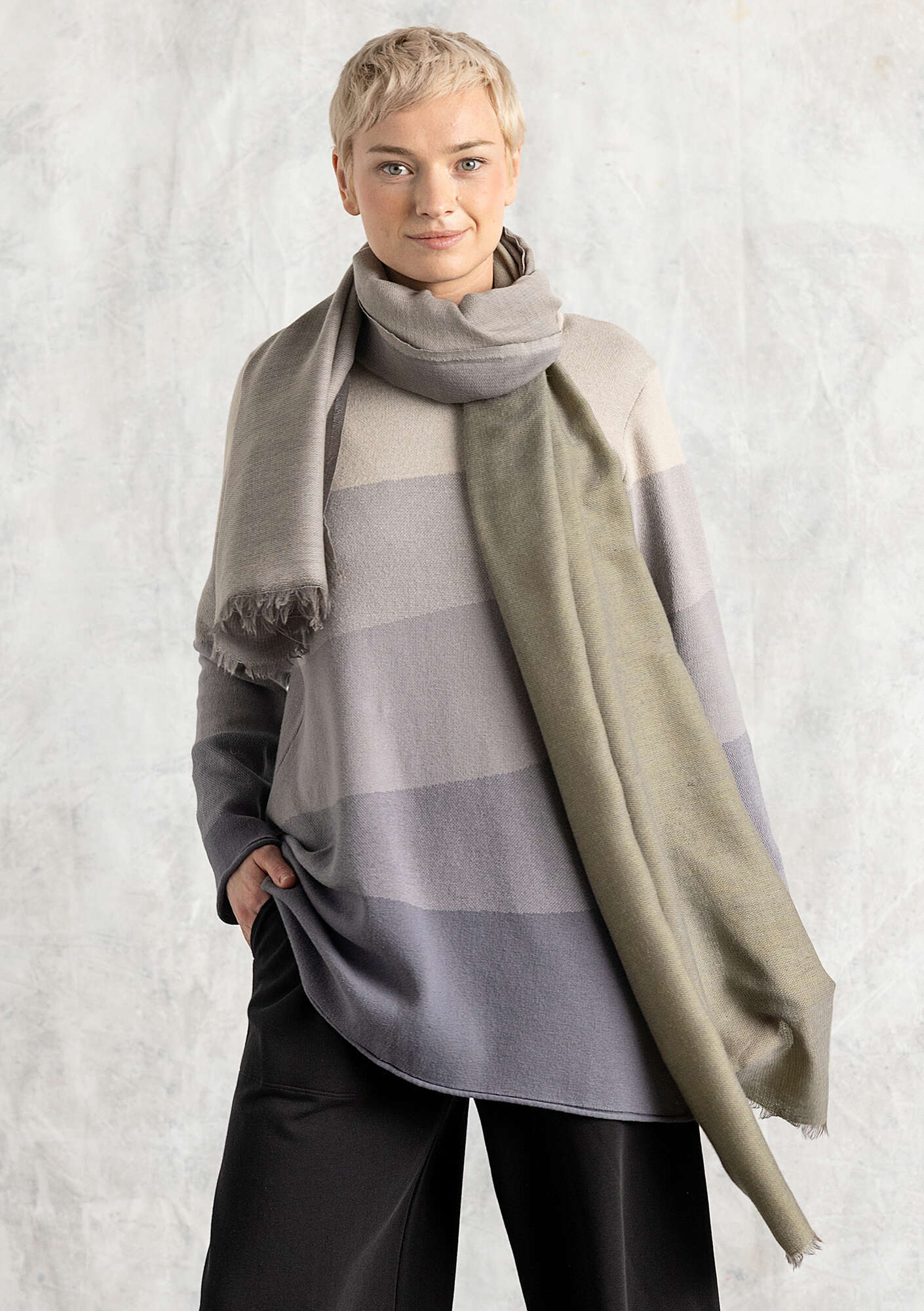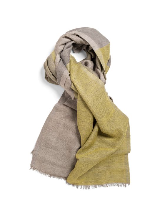 - A color-block shawl in soft and supple wool. The double-sided satin weave allows us to make this shawl with different colors on either side. A playful combination of colors.Material and Production